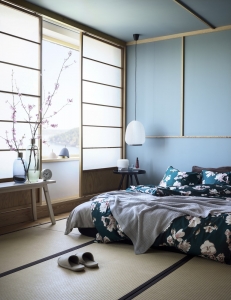 Syntolkning toppbild: Ett rum inrett i vad Åhléns uppfattar som japonistisk stil. Till vänster en pappersvägg, rakt fram ett T-format plagg på en stång. Möbler i naturmaterial. Foto: Åhléns press