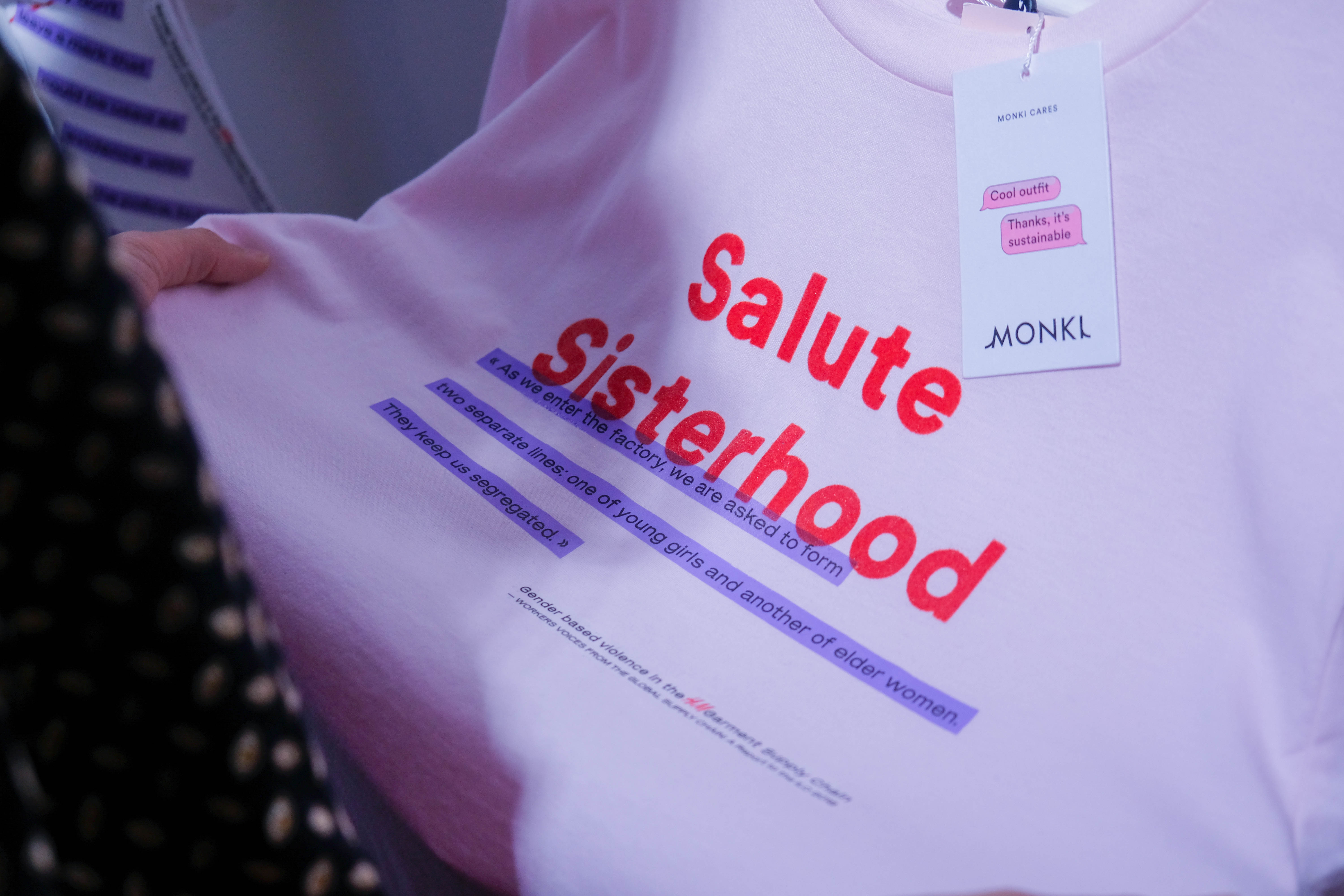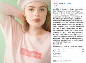 One of their brands, MONKI, is constructed around feminist narratives. The brand uses pale pink, body diversity and feminist statement as part of its identity. For its 10-year anniversary, the campaign Monkifesto highlighted 10 statements, such as “knowledge is queen”, “please yo’self” or “salute sisterhood”. They were advocating for women’s empowerment and claimed that as their brand values. But what is behind this marketing strategy? Does this company really “empowher” the women working in it? Under what conditions do the women who make these slogan tees really work?