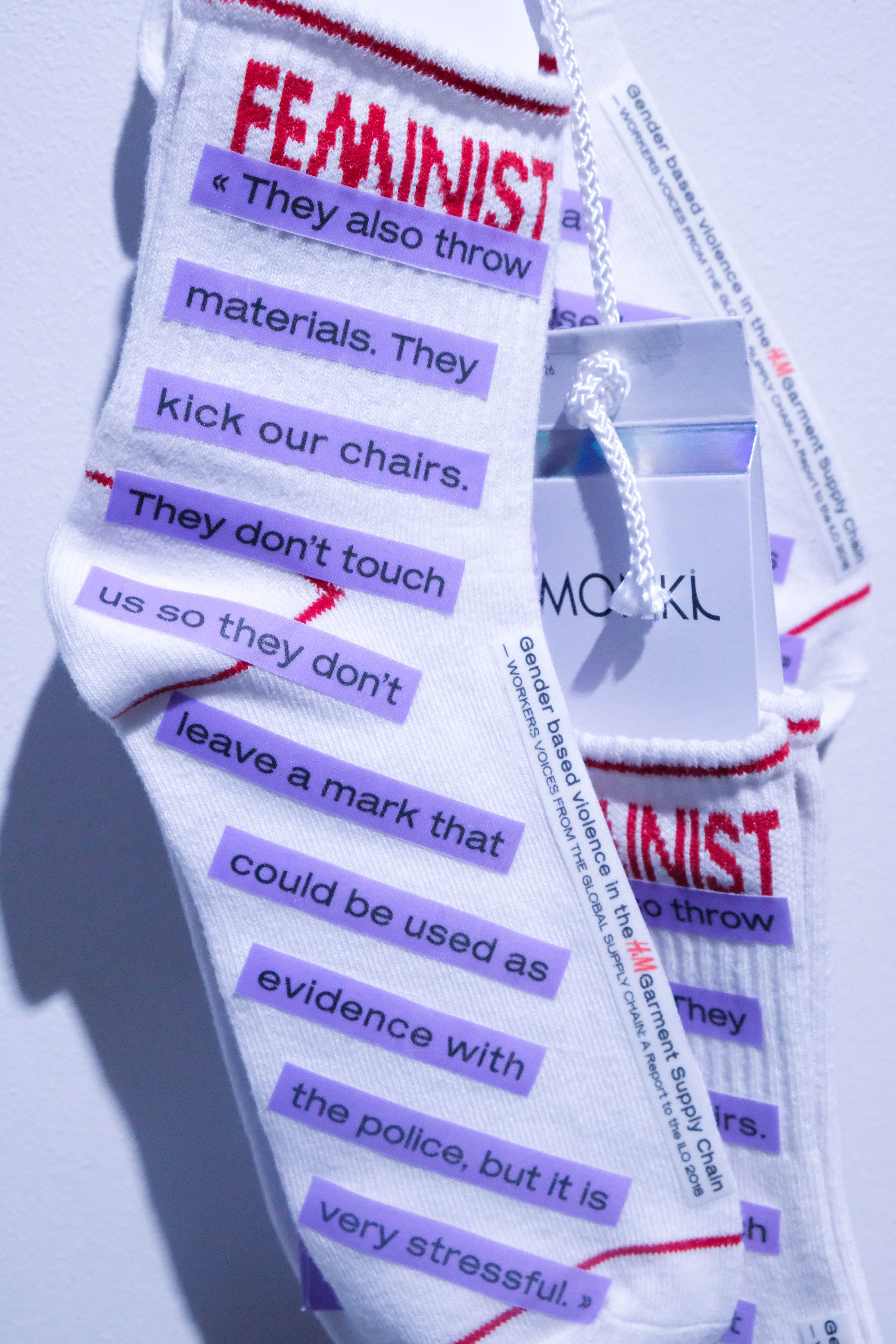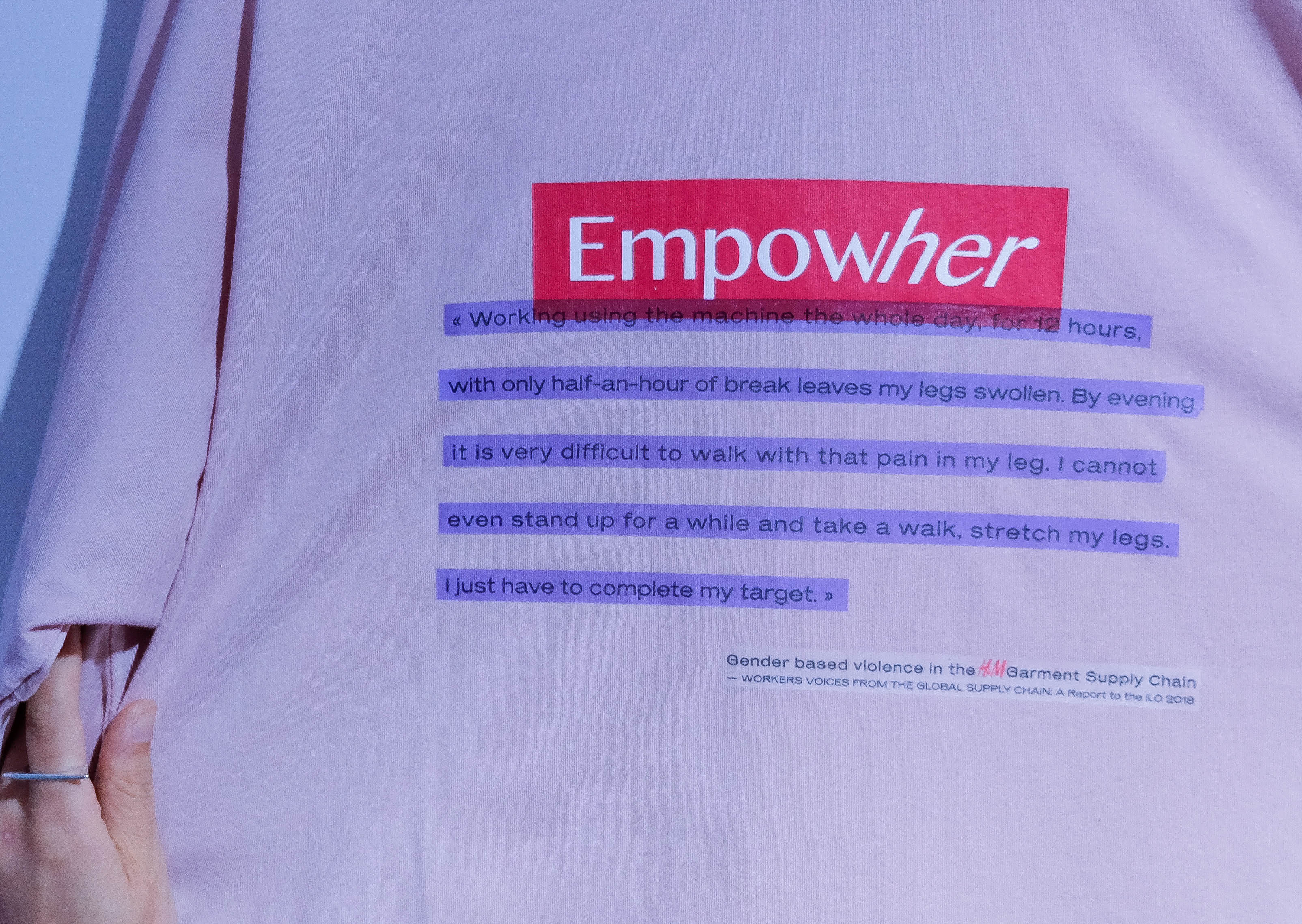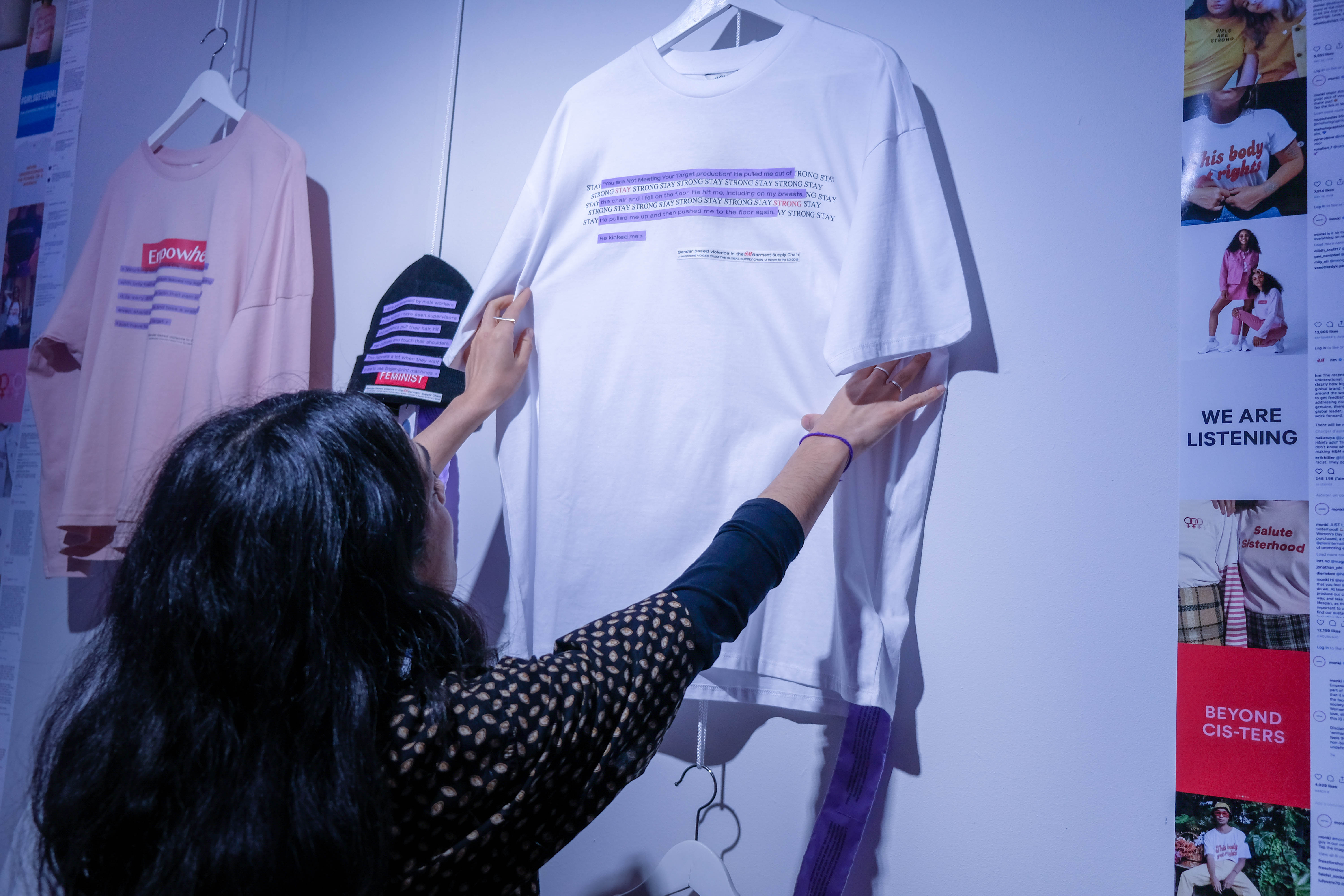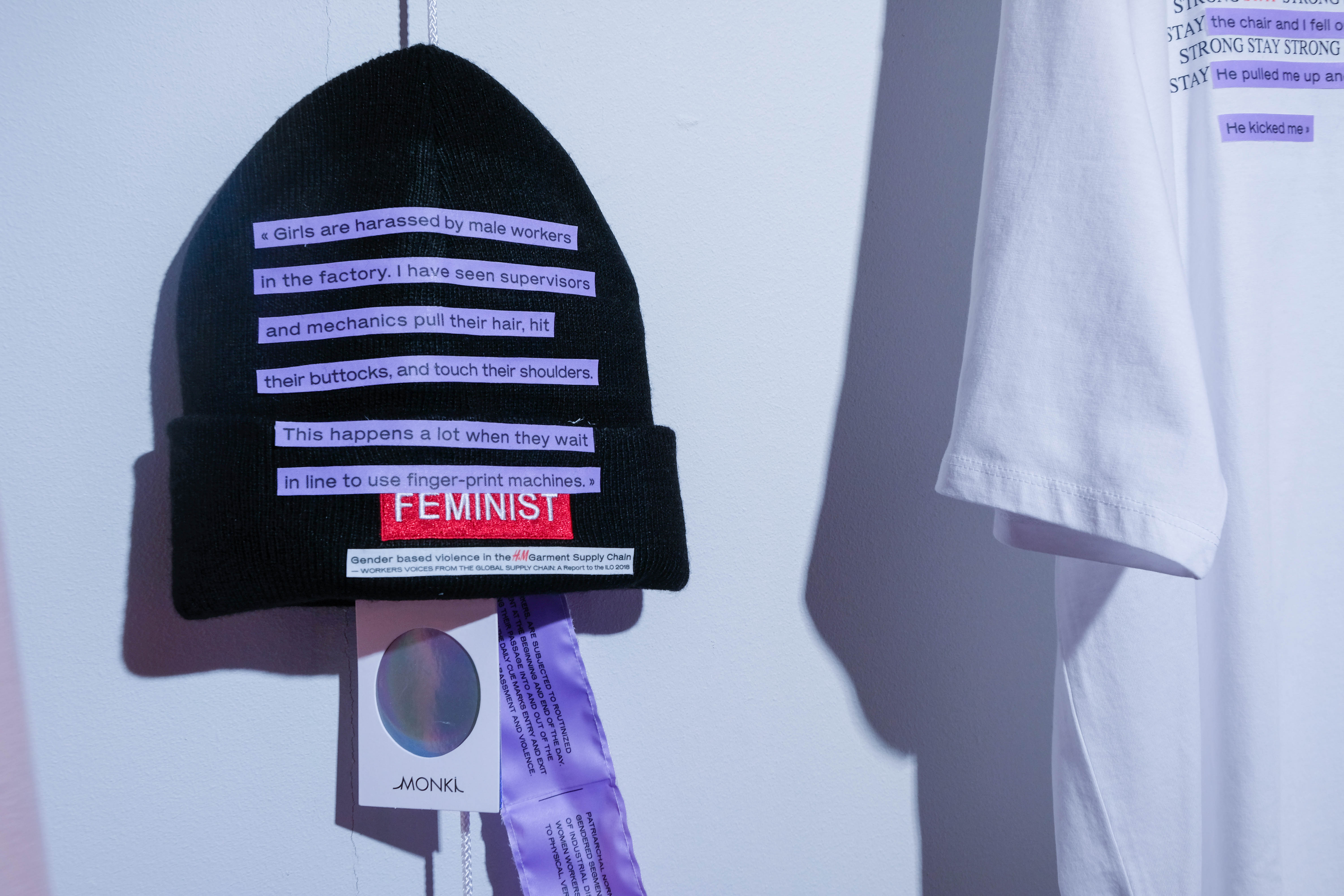 I have hijacked some of the H&M Group garments, the ones with feminist statements. I printed some parts of the report Gender-Based Violence in the H&M Garment Supply Chain, issued by workers’ rights group Asia Floor Wage, on top of the garments’ slogans. The workers’ voices, highlighting violence toward women in their factories, are disconnected from the initial message of the garment, denouncing what is happening inside the company.
