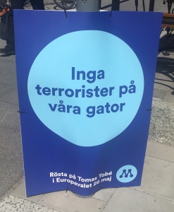 “Inga terrorister på våra gator. Rösta på Tomas Tobé i Europavalet 26 maj”. Foto: Macarena Dusant, 2019.