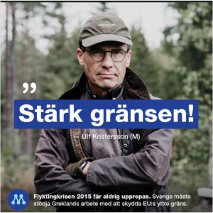 Måndagen 2 mars publicerade Moderaterna en bild i sitt instagramflöde där partiledaren Ulf Kristersson poserar i jaktkläder, med citatet “Stärk gränsen!” skrivet mitt över och texten “Fylktingkrisen 2015 får inte upprepas. Sverige måste stödja Greklands arbete med att skydda EU:s yttre gräns” skrivet längst ner. Bilden skapade stor uppståndelse i sociala medier eftersom fotografiet på Kristersson i kombination med budskapet tolkades som att Moderaterna stöttar tanken på att jaga och skjuta flyktingar Bilden byttes senare på eftermiddagen ut mot en med samma budskap, men där Kristersson istället bär kostym. Moderaterna menar att fotografiet inte är viktigt, utan enbart den politiska budskapet, och deras pressekreterare Siri Steijer säger att den första versionen “tog fokus” från den viktiga frågan.