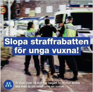 “Slopa straffrabatten för unga vuxna! Är man över 18 och har begått brott mot andra ska man ta sitt straff som en vuxen.” Skärmdump från Moderaternas Facebooksida 2020.