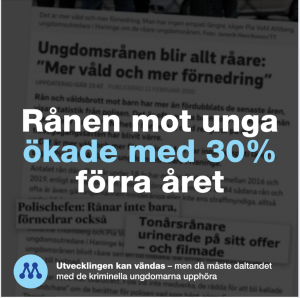 “Rånen mot de unga ökade med 30% förra året. Utvecklingen kan vändas – men då måste daltandet med de kriminella ungdomarna upphöra.” Skärmdump från Moderaternas Facebooksida 2020.