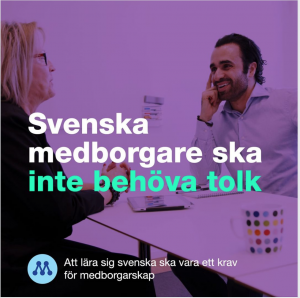 “Svenska medborgare ska inte behöva tolk. Att lära sig svenska ska vara ett krav för medborgarskap.” Skärmdump från Moderaternas Facebooksida 2020.