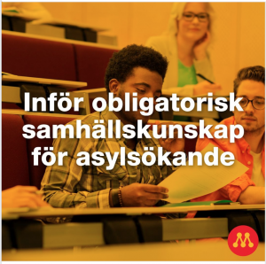 “Inför obligatoriskt samhällskunskap för asylsökande.” Skärmdump från Moderaternas Facebooksida 2020.