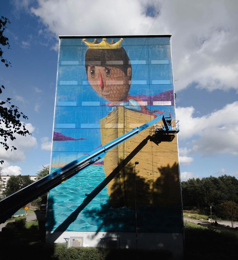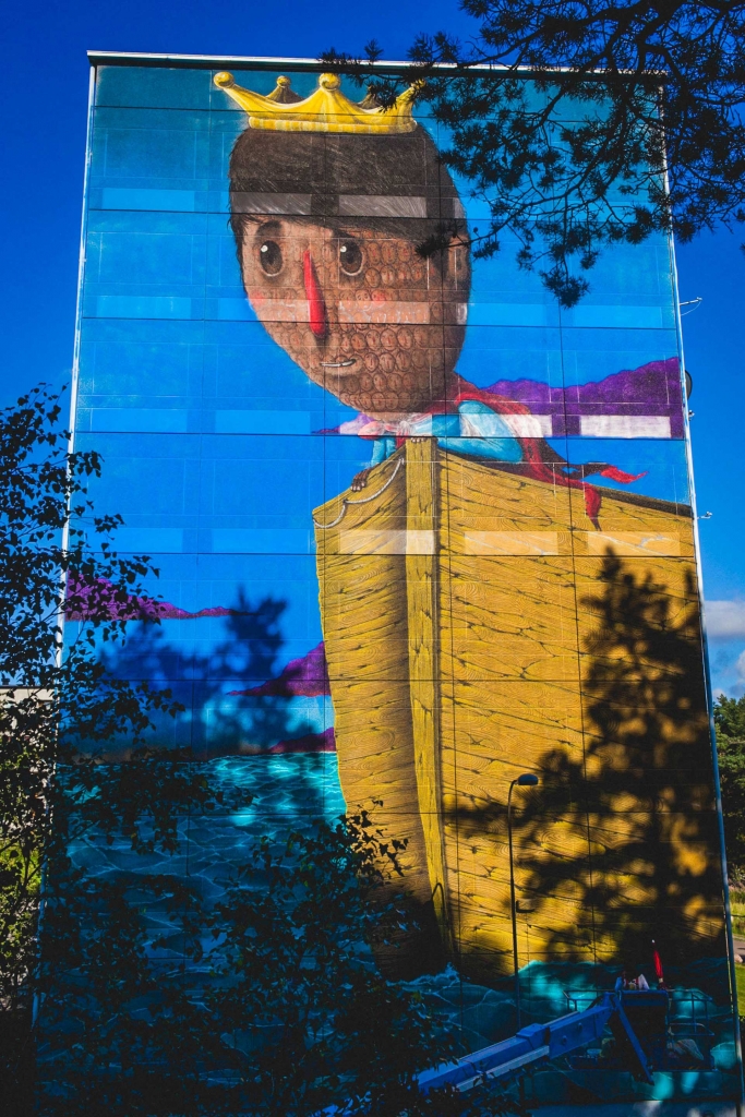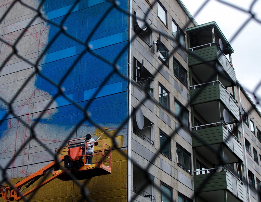 Jag bestämde mig för att belysa migrantfrågan för att den är viktig just nu och att den också passar med stadsdelen Hammarkullen. Först var det bara något man berättade för mig, men efter ett tag kunde jag känna dess kontext i och med att jag bodde där under tiden jag utformade och målade min mural. Detta närde både min och muralens utveckling.
