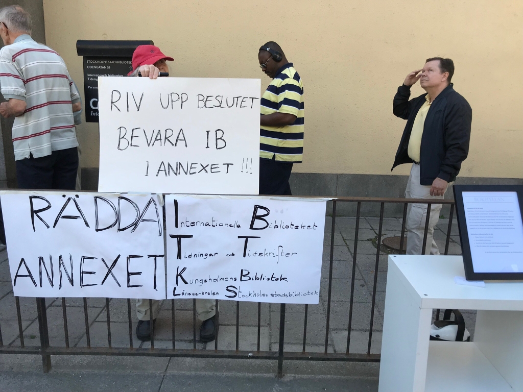 Kulturnämnden i Stockholms stad beslutade tidigare i år om att säga upp IB:s hyresavtal i Annexet där Internationella biblioteket idag har sin verksamhet, vilket innebär att det stänger för publik verksamhet den 2 september och flyttas till det betydligt mindre Kungsholmens bibliotek, där det kläms ihop med det redan befintliga lokala biblioteket där. IB är Sveriges största centrum för mångspråkig litteratur, ett av de största i sitt slag i Europa, som i tjugo år har varit en viktig samlingsplats för såväl nyanlända som etablerade invandrare som inte har svenska som förstaspråk, för allmänt språk- och litteraturintresserade, för översättare och för forskare. Det unika bokbeståndet om 200 000 böcker på över 100 språk splittras och den mycket kompetenta personalen – som talar ett tjugotal språk – kommer antingen att få sluta eller spridas ut.